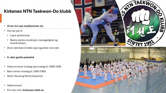 For mer info: https://kirkenes.ntkd.no/om-taekwon-do